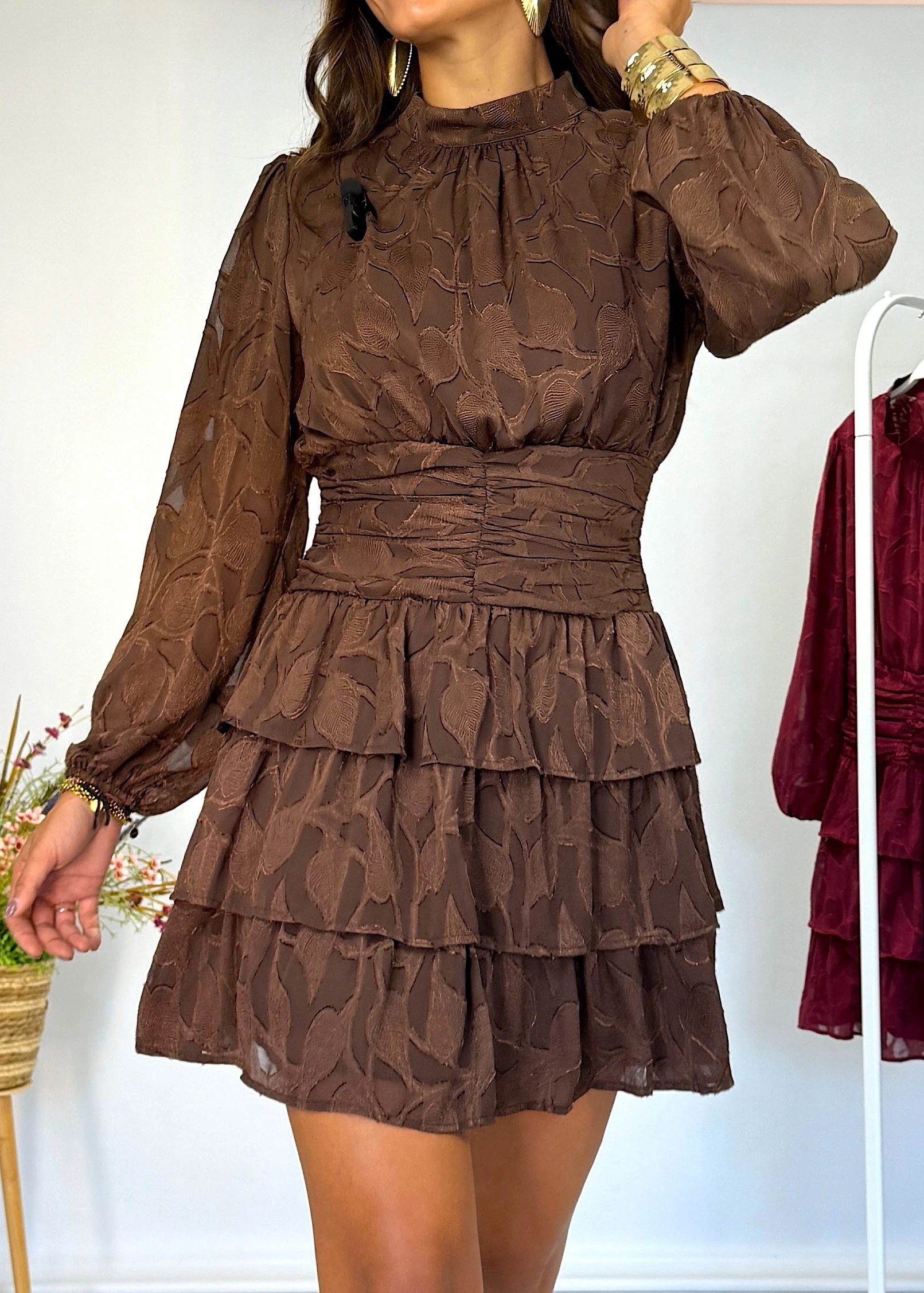 Vestido marron con mangas abullonadas y falda de volantes. Su fajín realza la cintura con elegancia y un ajuste cómodo.