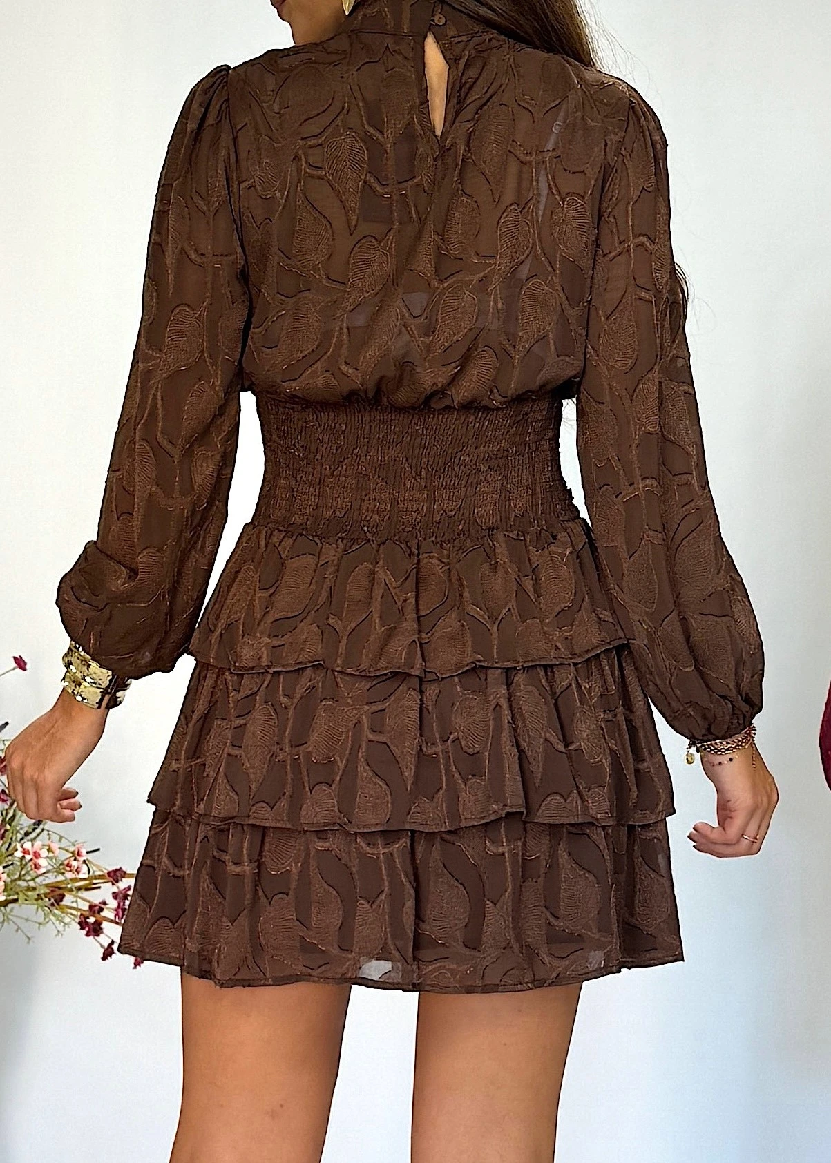 Vestido marrón de gasa con mangas abullonadas y falda de volantes, una prenda femenina y favorecedora que combina movimiento y estilo.