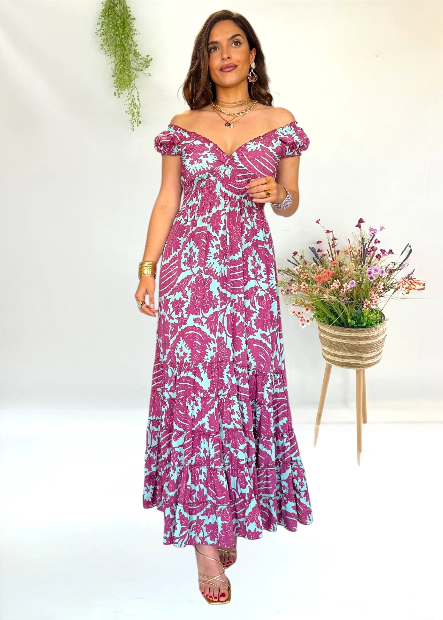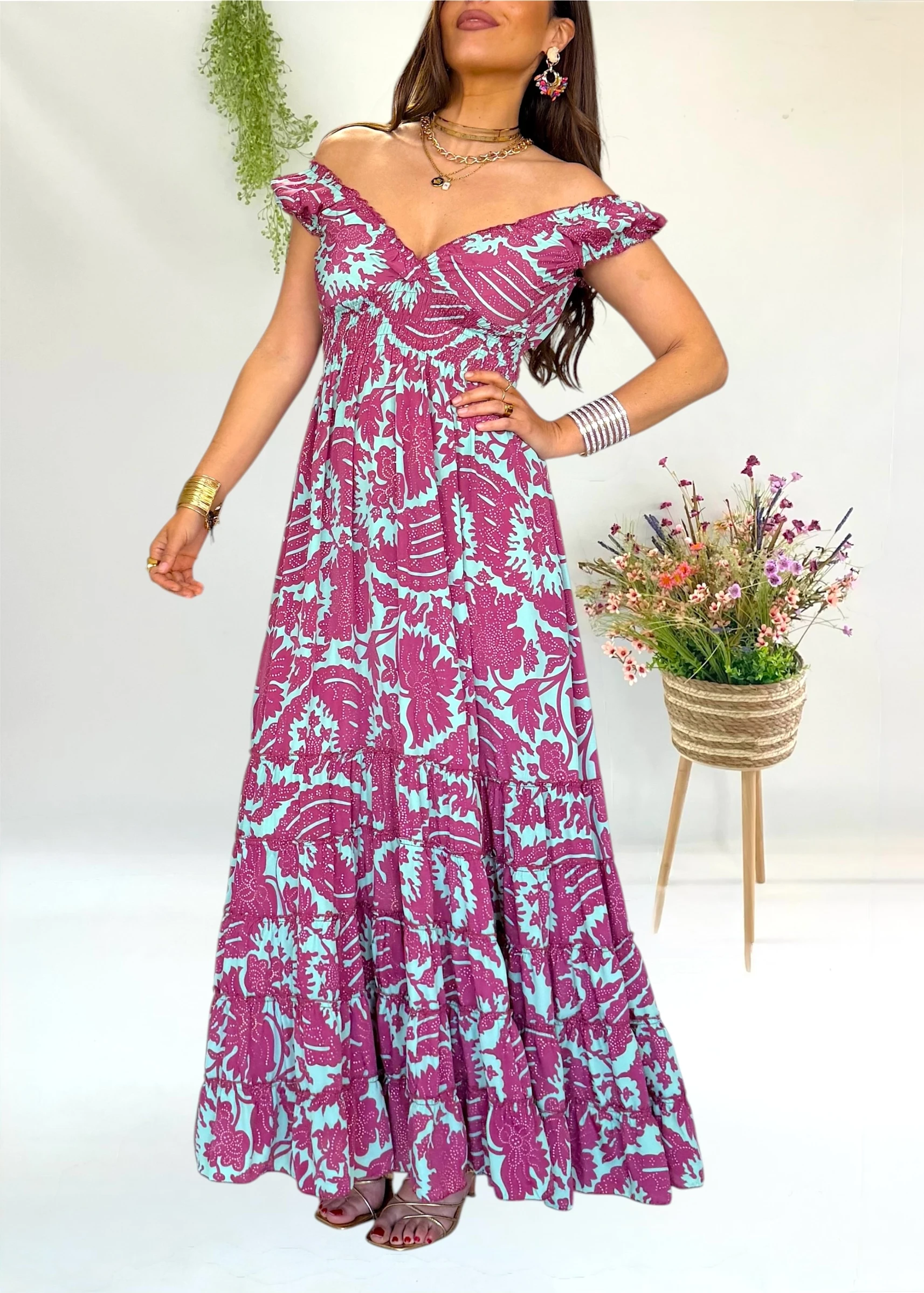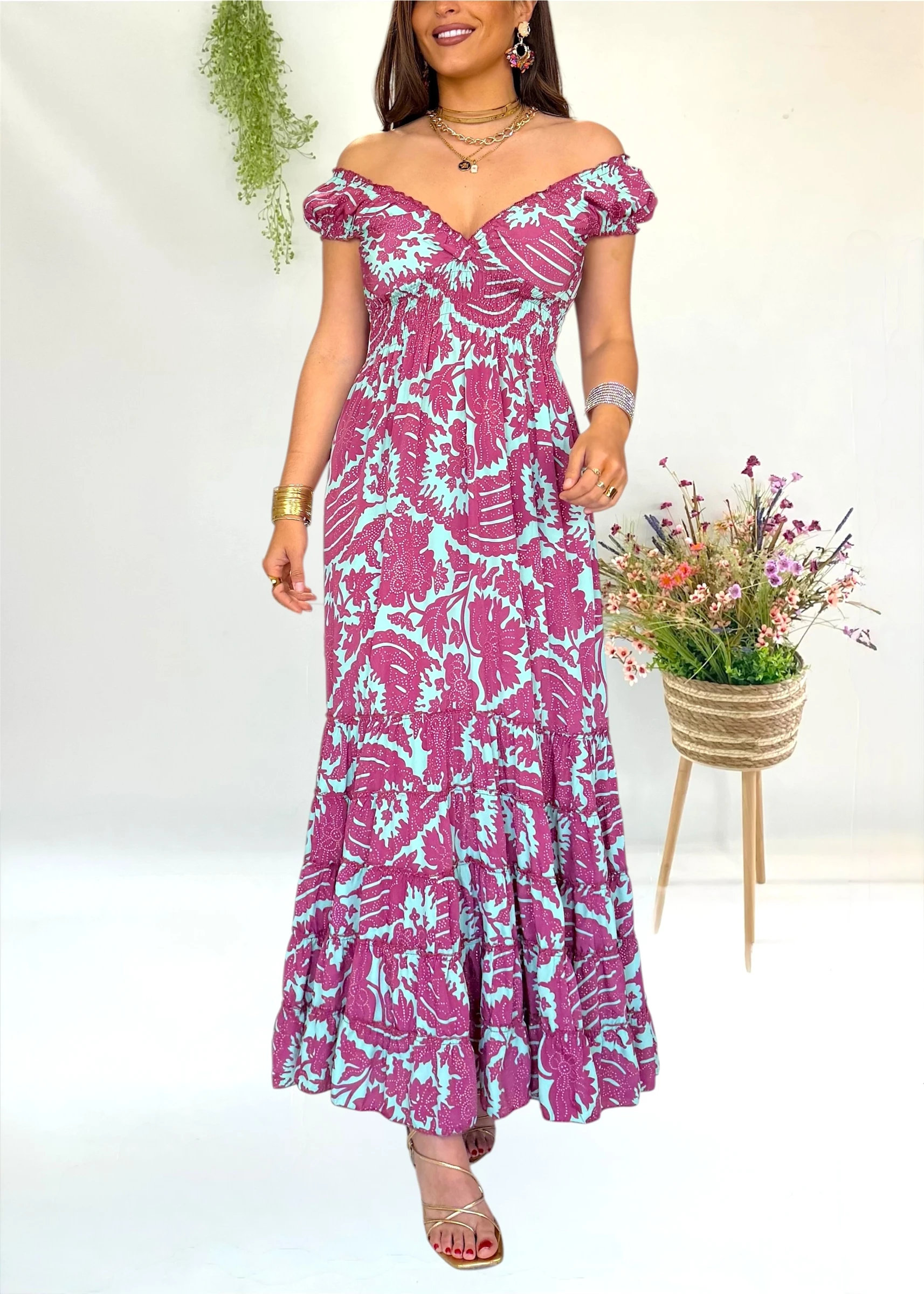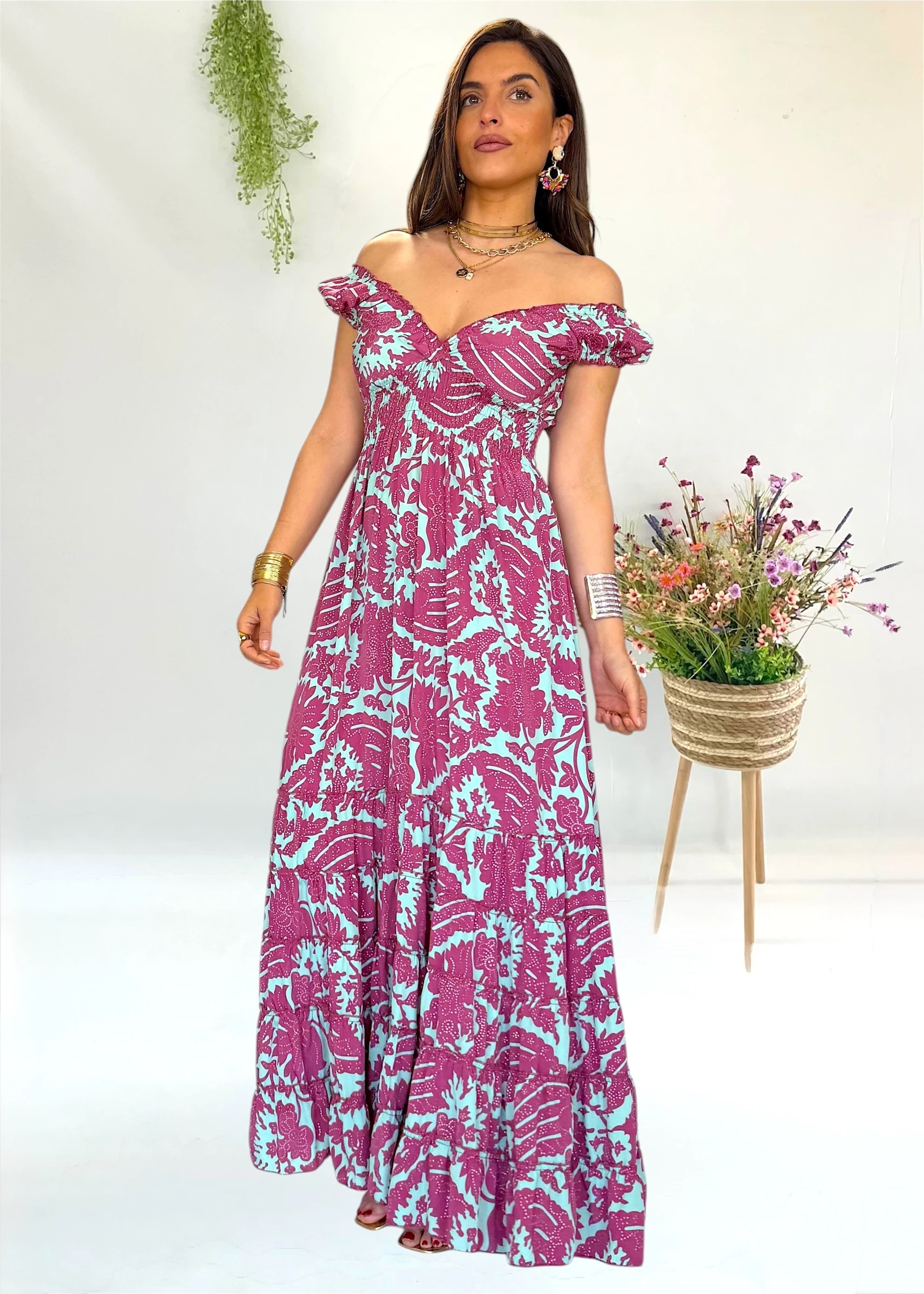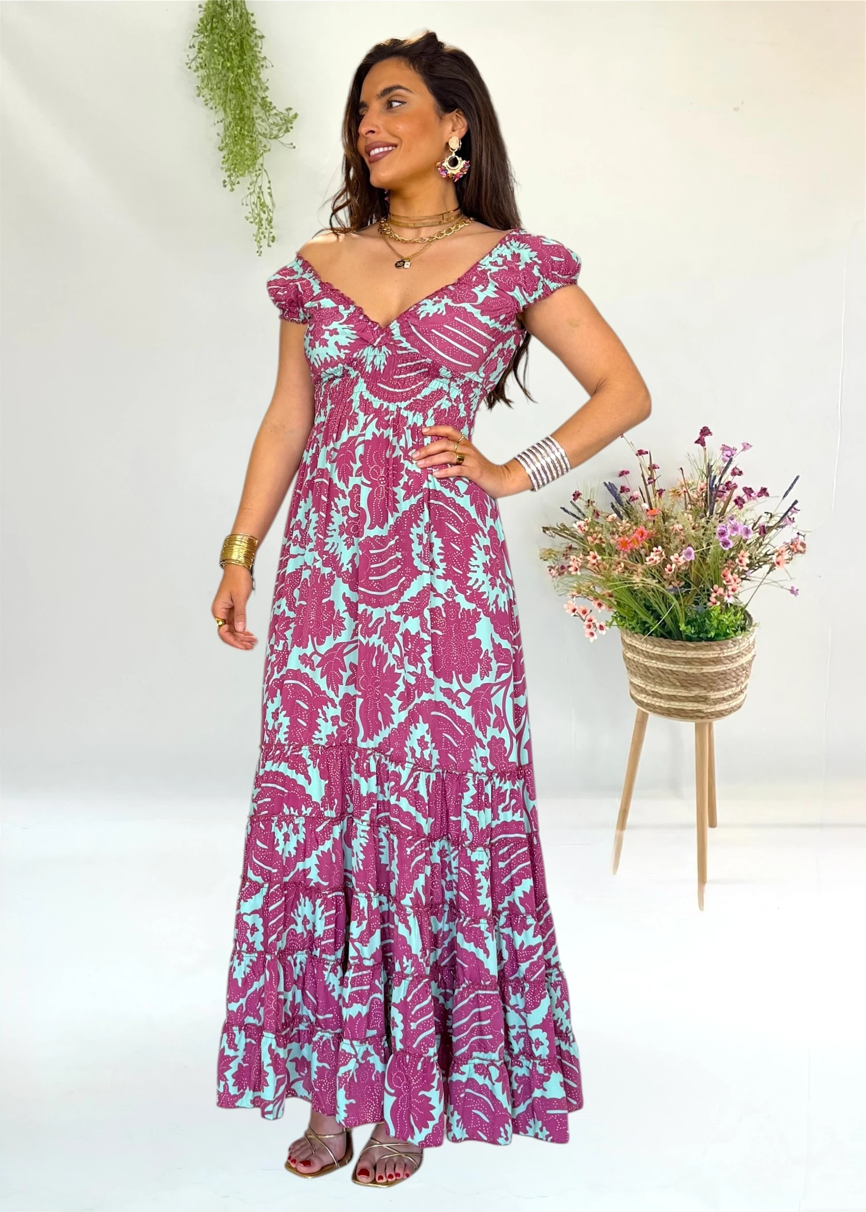 Este vestido largo estampado de la firma española Trilce que puedes llevar en un evento y depues en cualquier cena o dia de verano con un look mas casual 💗