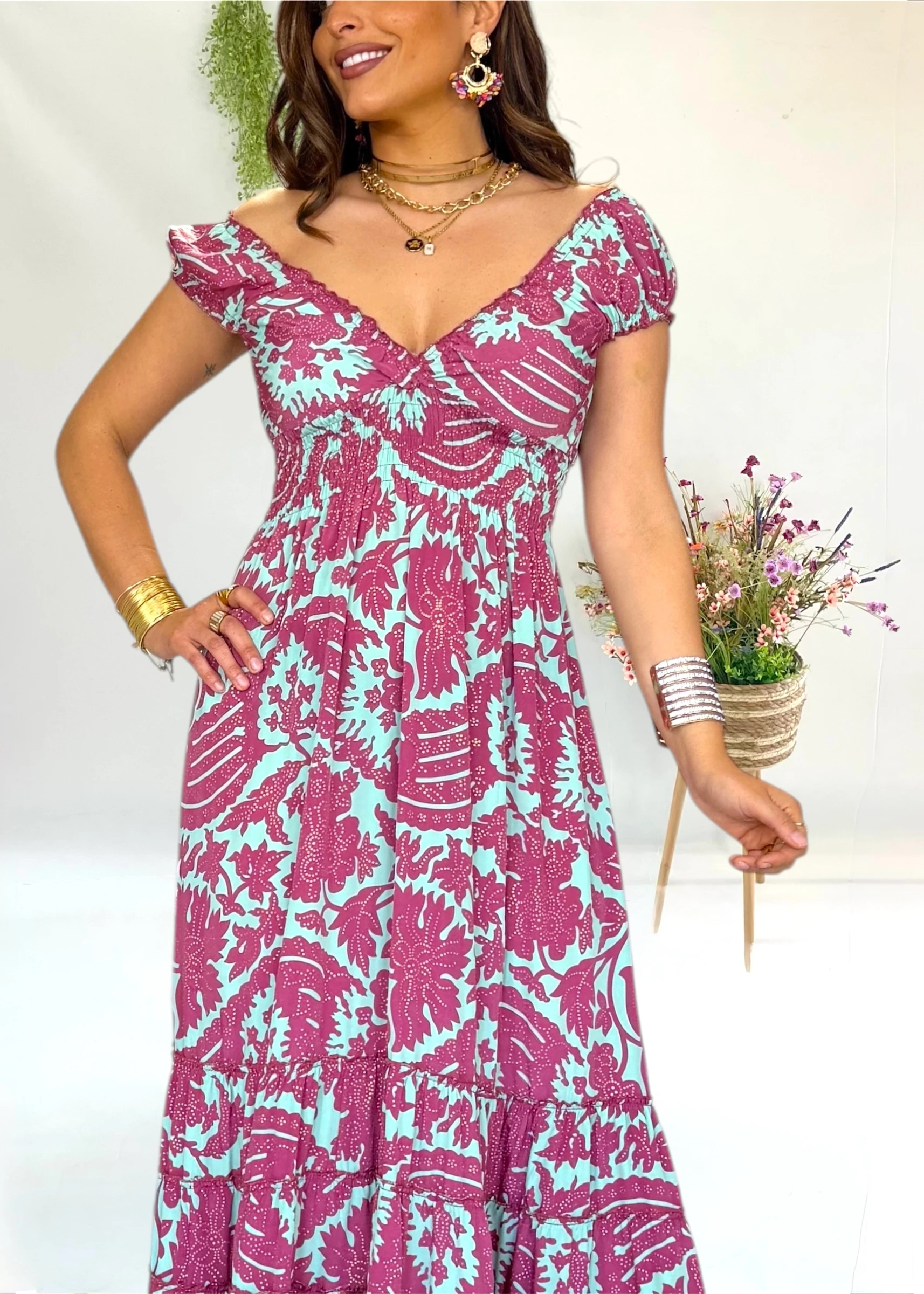 Vestido largo en color de fondo verde aguamarina combinado con borgoña 💗 Lo puedes llevar o para un evento o cualquier noche de verano