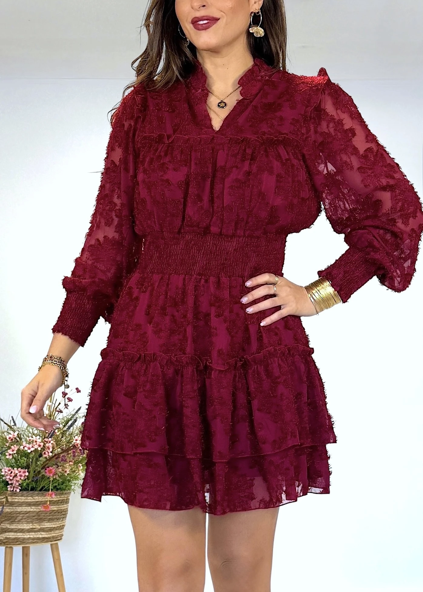Vestido corto de gasa en tono burdeos con un delicado estampado en relieve que aporta textura y estilo. Un diseño muy favorecedor con escote en pico, volantes sutiles y falda en capas.