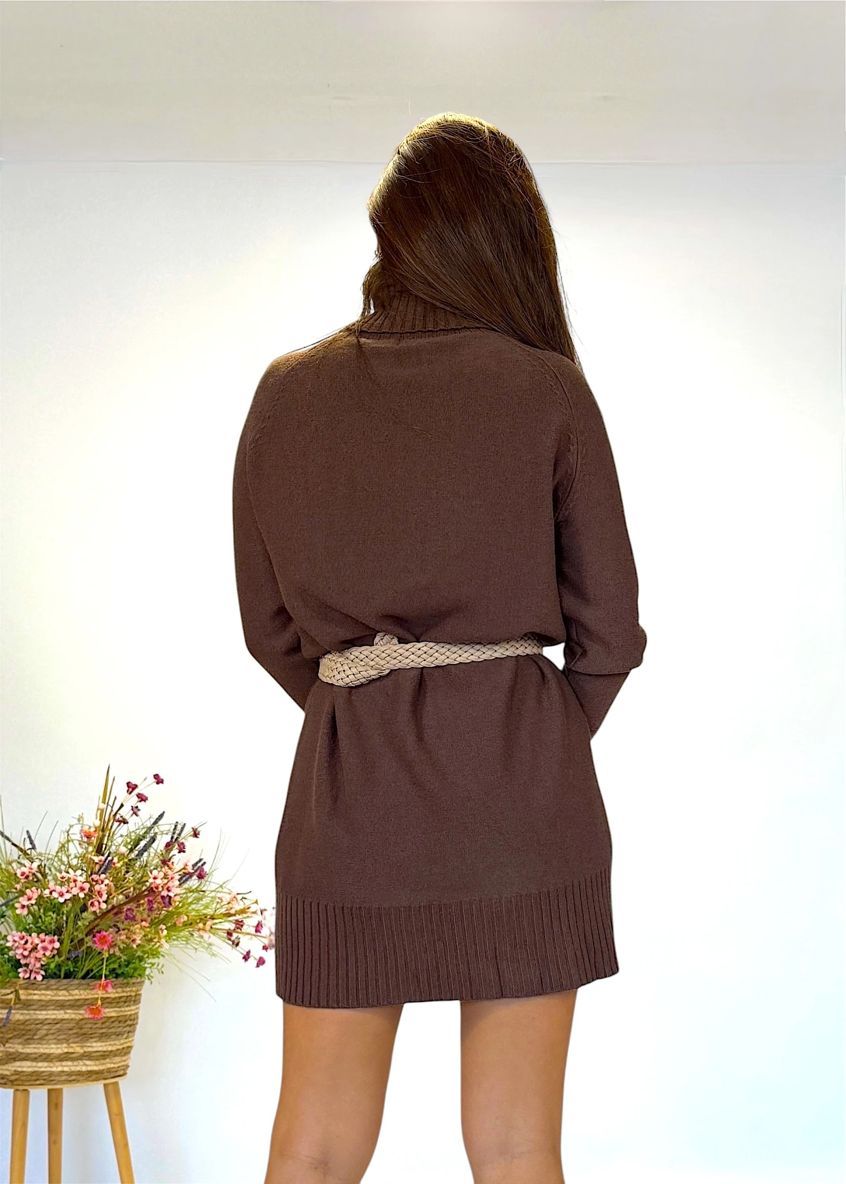 Vestido de punto marrón con cuello vuelto y detalle trenzado. El cinturón no está incluido, puedes ponerle cuaquier cinturon que tengas en tu armario y quedará genial