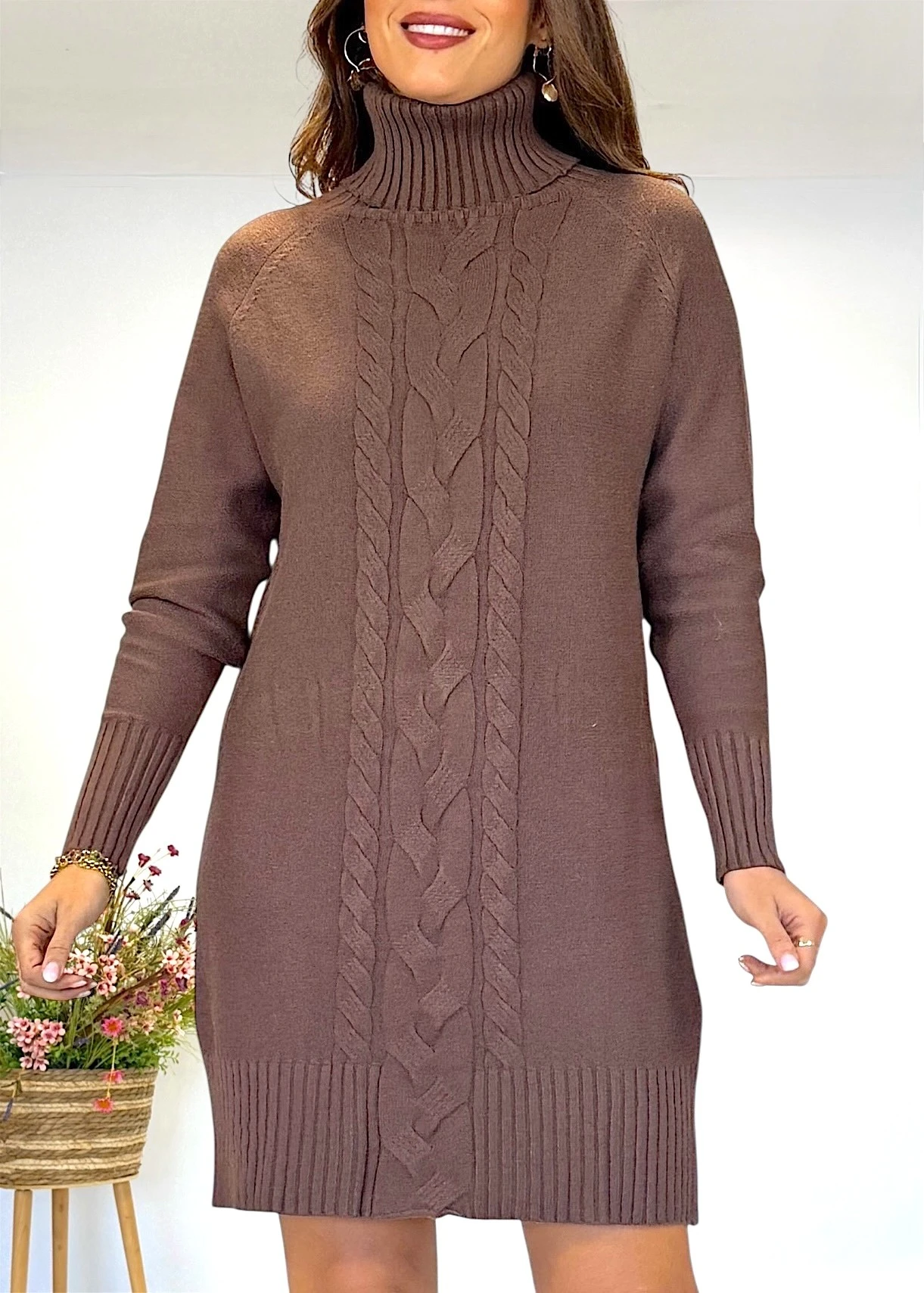 Vestido de punto marrón con cuello vuelto que no aprieta, tejido suave y gustoso. Lleva detalle trenzado en el centro y acabados en canalé. Se puede llevar suelto o ajustado con cinturón (no incluido), tal como lo luce la modelo. Combinaló con cualquier cinturon que tengas en tu armario y quedará igual que coomo lo lleva la modelo