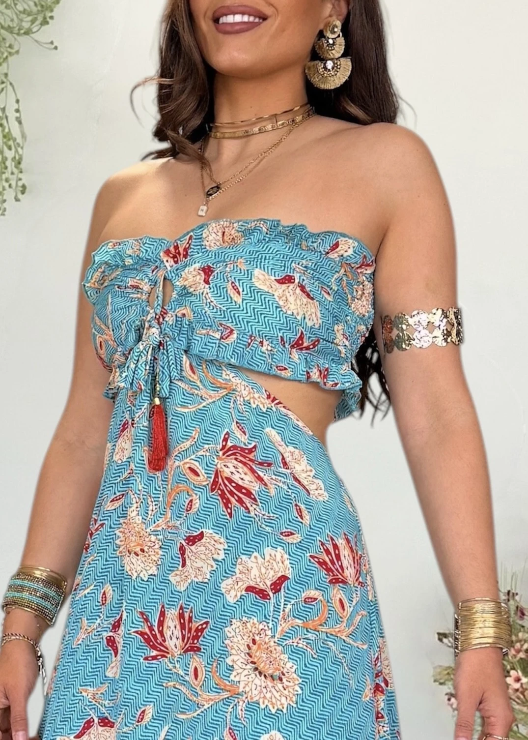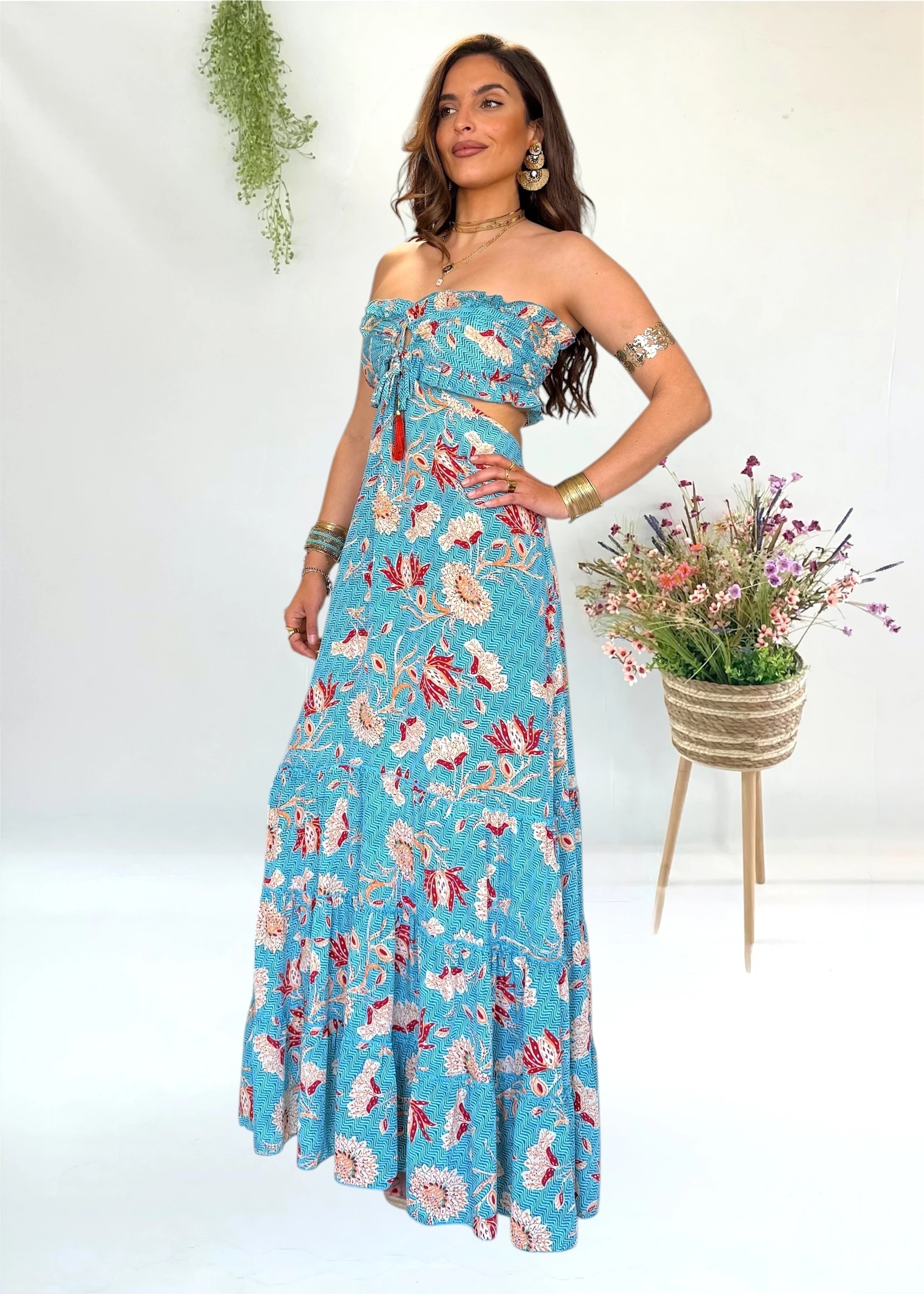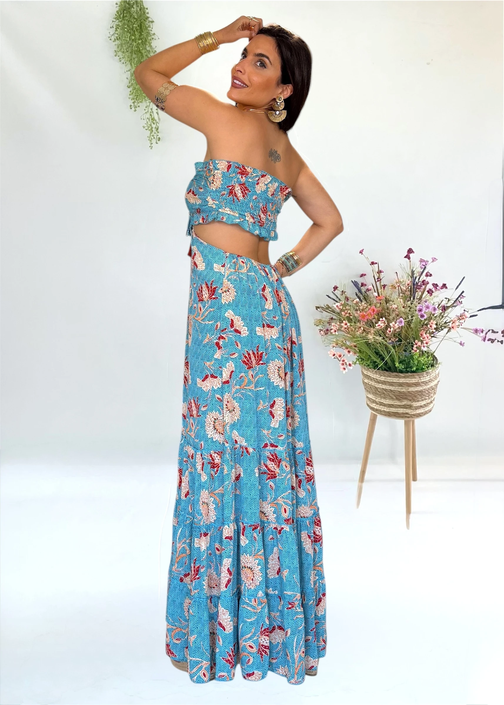 Vestido largo estilo trikini de la firma Trilce, una propuesta de diseño español que combina originalidad y elegancia con su estampado exclusivo lleno de color.