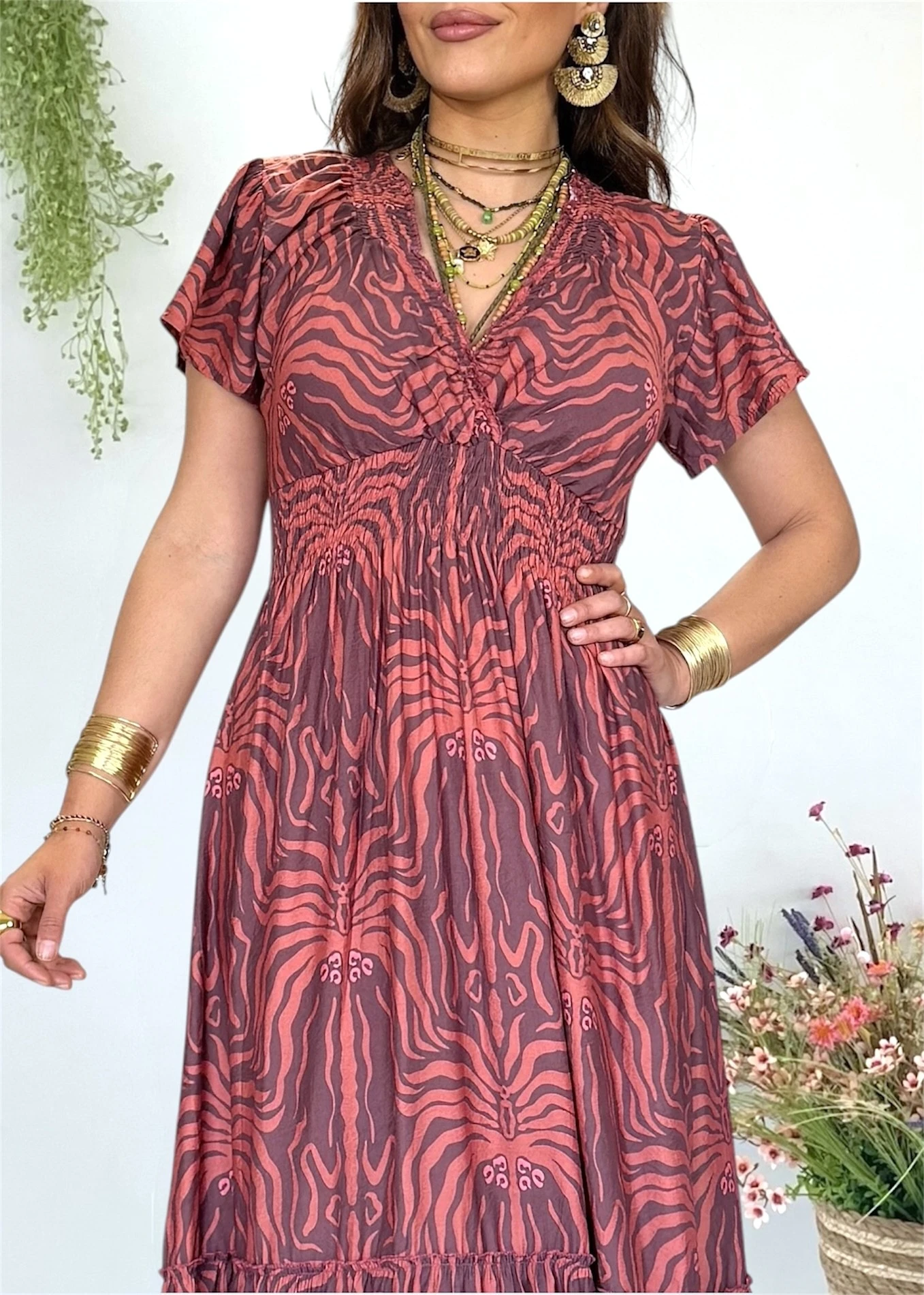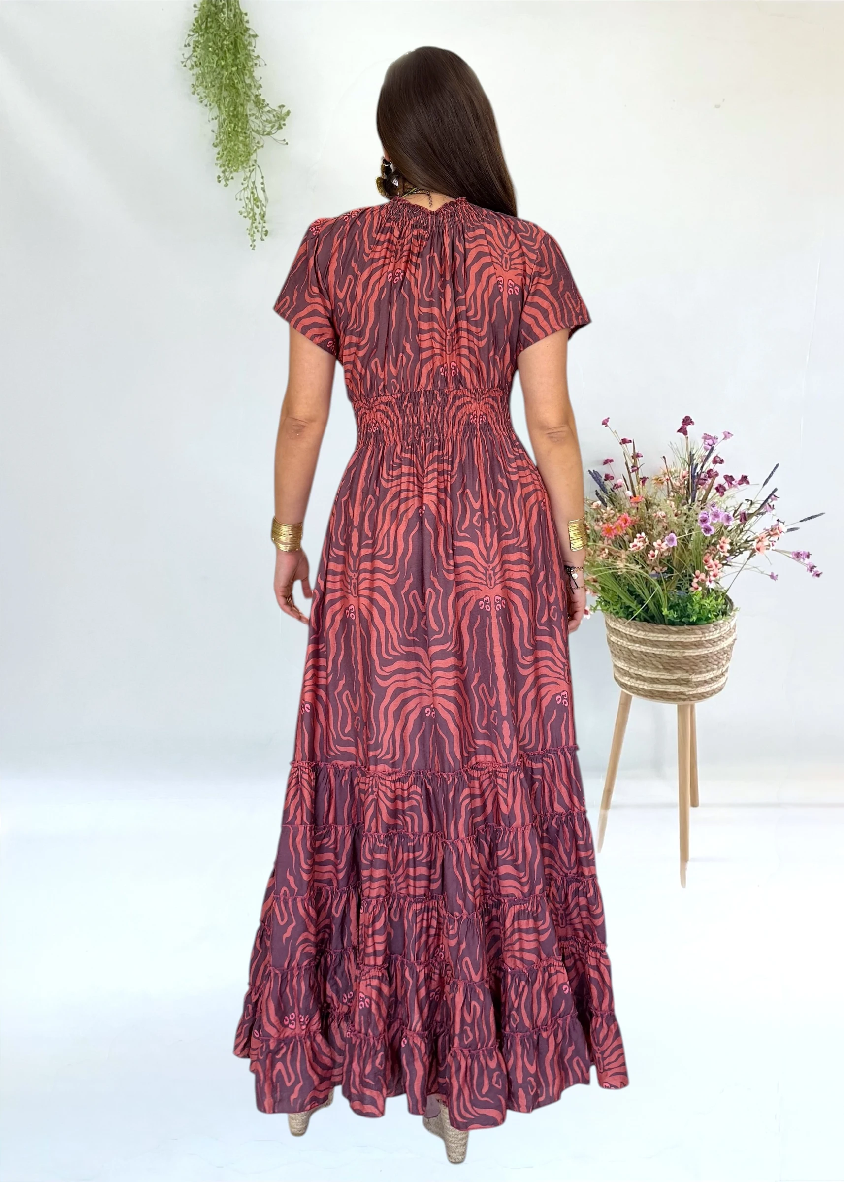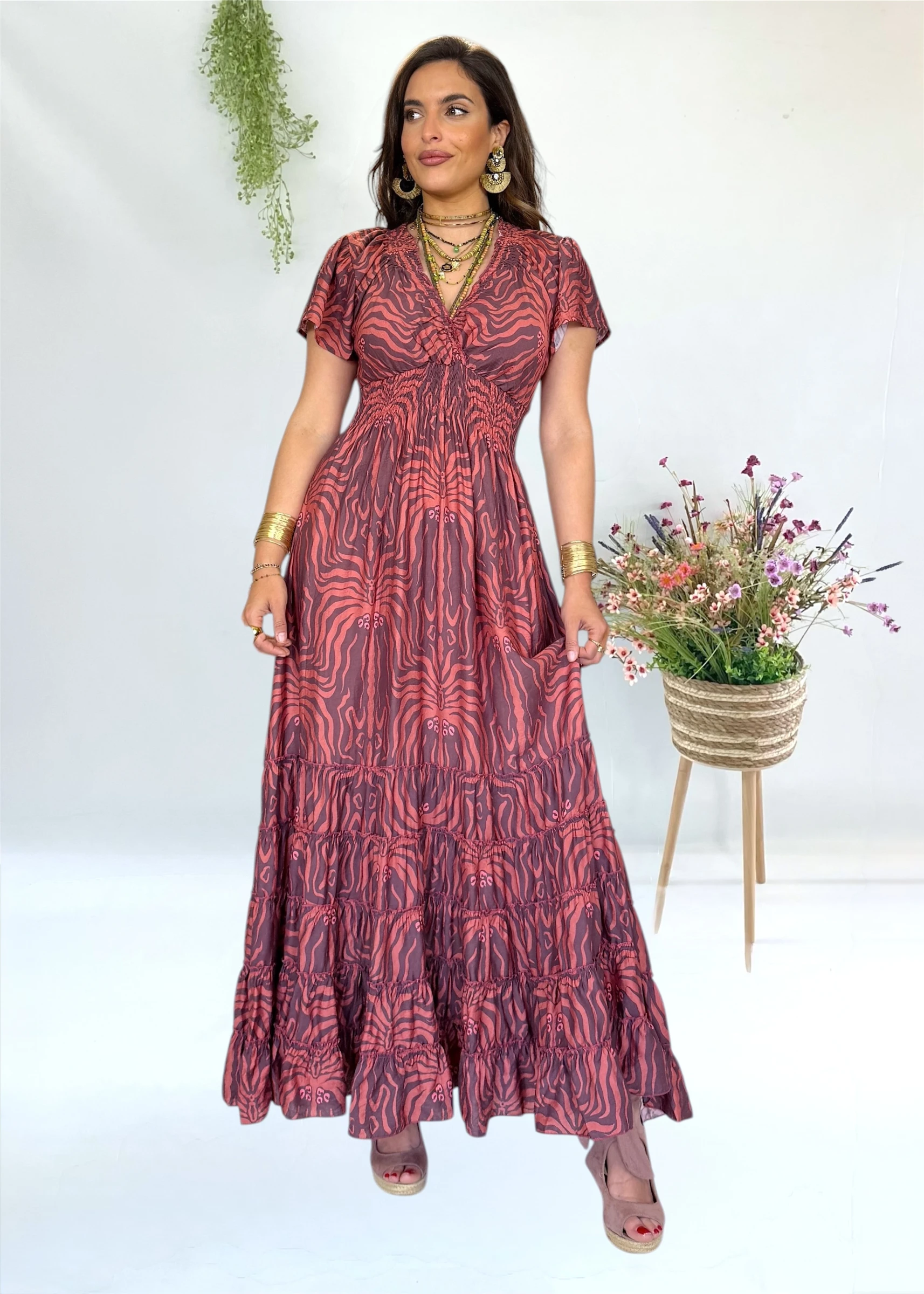 Vestido largo de la firma Trilce, diseño y moda española que destaca por su estampado en tonos cálidos y su estilo fluido con esencia boho.